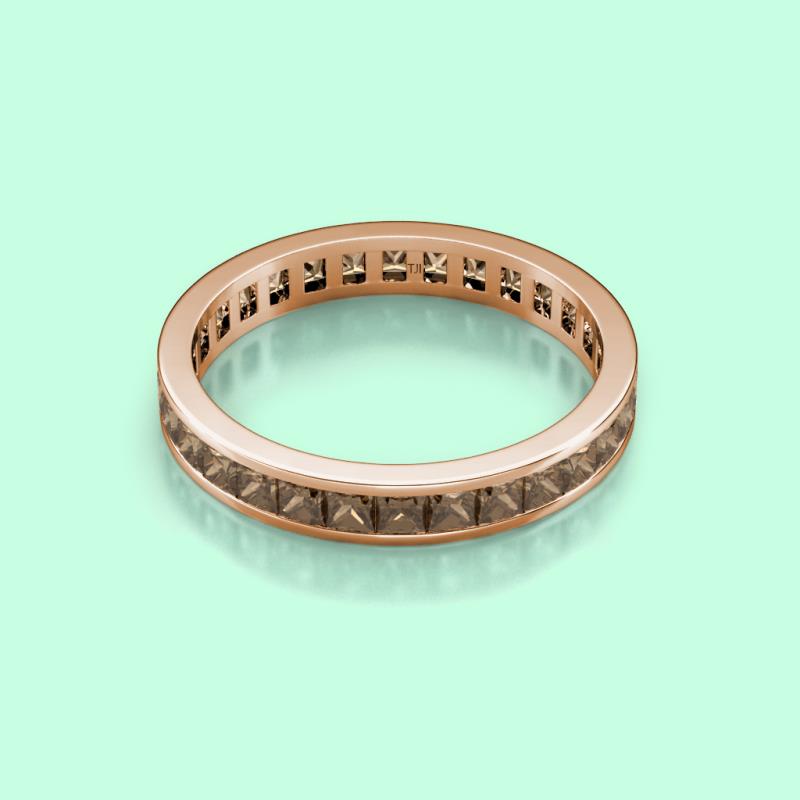 Shining with opulence and femine appeal, this Eternity Band inspires any attire with Glittering Princess Cut Channel Set Smoky Quartz symbolizing the Eternal Circle of Love. *As per ring size the stone and carat total weight changes.