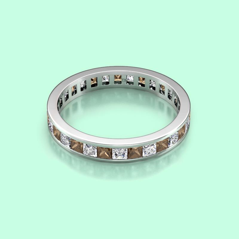 Shining with opulence and femine appeal, this Eternity Band inspires any attire with Glittering Princess Cut Channel Set Smoky Quartz and Diamond symbolizing the Eternal Circle of Love. *As per ring size the stone and carat total weight changes.
