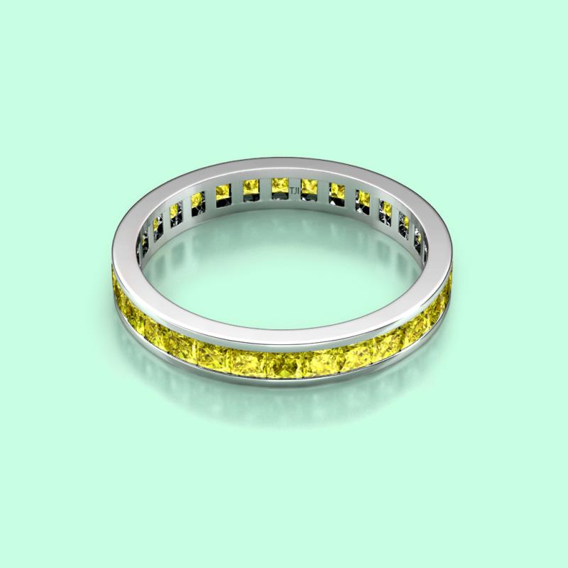 Shining with opulence and femine appeal, this Eternity Band inspires any attire with Glittering Princess Cut Channel Set Yellow Diamond symbolizing the Eternal Circle of Love. *As per ring size the stone and carat total weight changes.