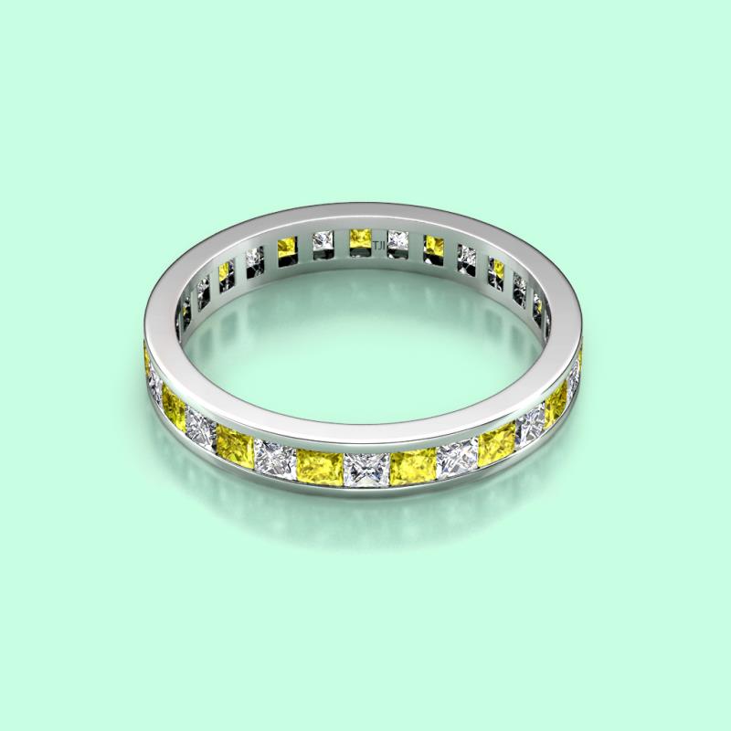 Shining with opulence and femine appeal, this Eternity Band inspires any attire with Glittering Princess Cut Channel Set Yellow Diamond and Lab Grown Diamond symbolizing the Eternal Circle of Love. *As per ring size the stone and carat total weight changes.
