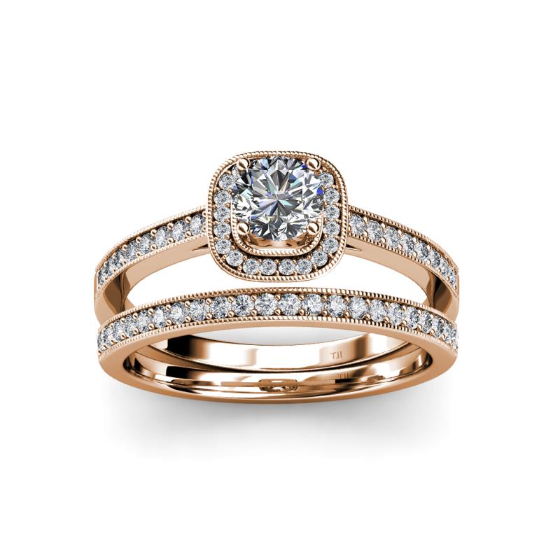0.77 ctw Natural Diamond (4.80 mm) Four Prong Halo Engagement Ring & Wedding Band with Milgrain Work in 14K Rose Gold More Details ...
