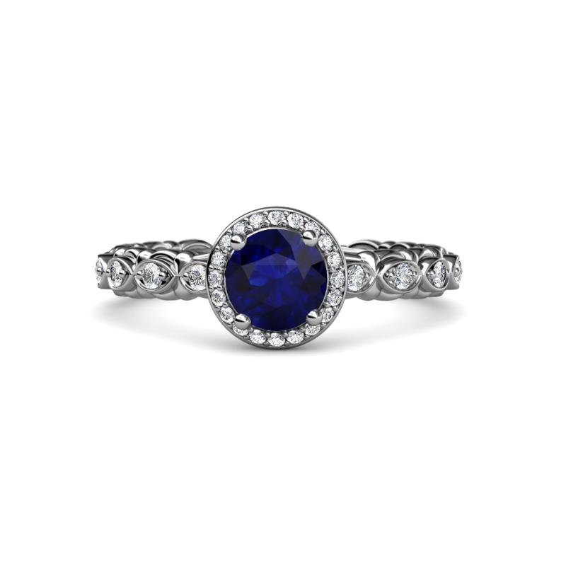 1 1/5 ct Round Blue Sapphire and Diamond Cascading Scalloped Shank Womens Halo Engagement Ring 14K White Gold More Details ...