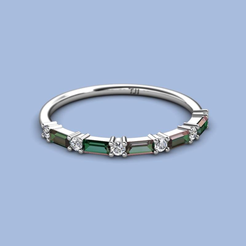 This spectacular Wedding Band has Baguette Lab Created Alexandrite and Round Diamond that shimmers perfectly together and completes the ensemble on your Wedding Day.