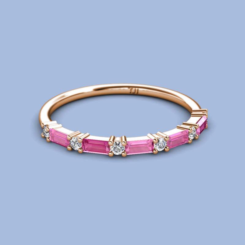 Baguette (4x2 mm) Pink Sapphire and Round Diamond 1 1/6 ctw Womens Wedding Band Stackable 10K Rose Gold More Details ...