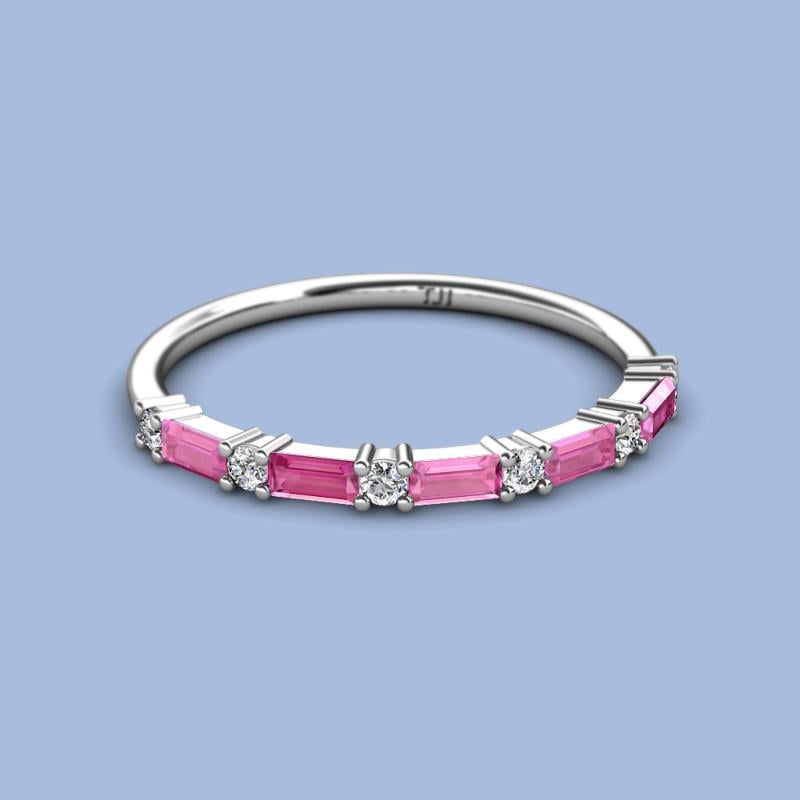This spectacular Wedding Band has Baguette Pink Sapphire and Round Diamond that shimmers perfectly together and completes the ensemble on your Wedding Day.