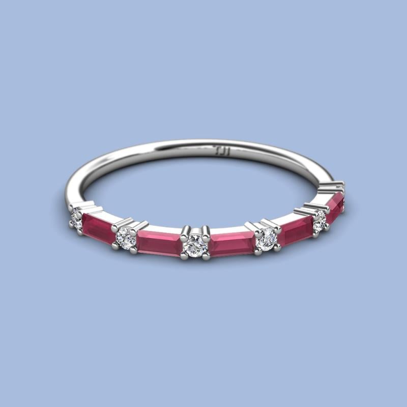 This spectacular Wedding Band has Baguette Rhodolite Garnet and Round Diamond that shimmers perfectly together and completes the ensemble on your Wedding Day.