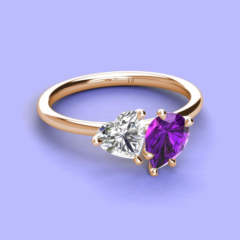 There's something so romantic, and oh-so-enchanting about this duo two stone engagement ring. This spectacular design features GIA Certified Heart Shape Diamond & Pear Shape Amethyst that sets at slight angles towards each other.