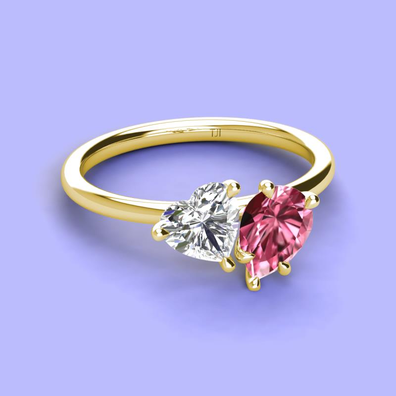 There's something so romantic, and oh-so-enchanting about this duo two stone engagement ring. This spectacular design features GIA Certified Heart Shape Diamond & Pear Shape Pink Tourmaline that sets at slight angles towards each other.