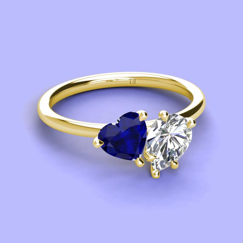 There's something so romantic, and oh-so-enchanting about this duo two stone engagement ring. This spectacular design features Heart Shape Lab Created Blue Sapphire and Pear Shape GIA Certified Diamond that sets at slight angles towards each other.