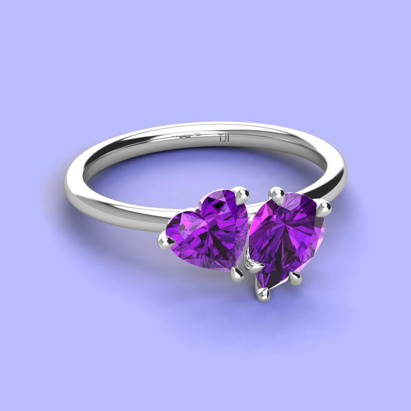 There's something so romantic, and oh-so-enchanting about this duo two stone engagement ring. This spectacular design features Heart & Pear shape Amethyst that sets at slight angles towards each other.