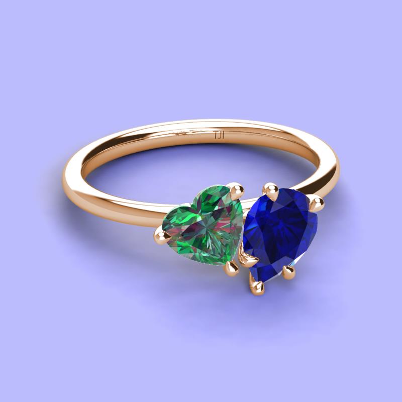 There's something so romantic, and oh-so-enchanting about this duo two stone engagement ring. This spectacular design features Heart Shape Lab Created Alexandrite and Pear Shape Lab Created Blue Sapphire that sets at slight angles towards each other.