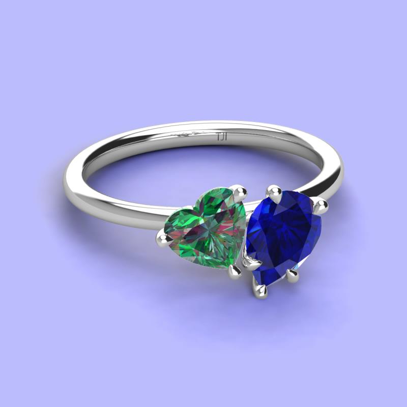 There's something so romantic, and oh-so-enchanting about this duo two stone engagement ring. This spectacular design features Heart Shape Lab Created Alexandrite and Pear Shape Lab Created Blue Sapphire that sets at slight angles towards each other.