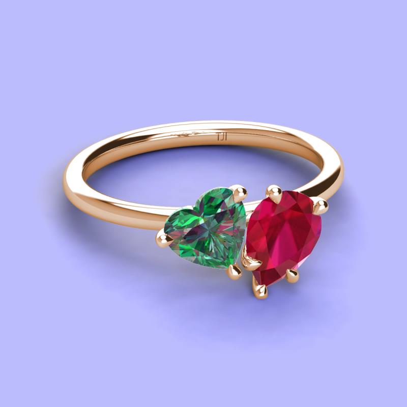 There's something so romantic, and oh-so-enchanting about this duo two stone engagement ring. This spectacular design features Heart Shape Lab Created Alexandrite and Pear Shape Lab Created Ruby that sets at slight angles towards each other.