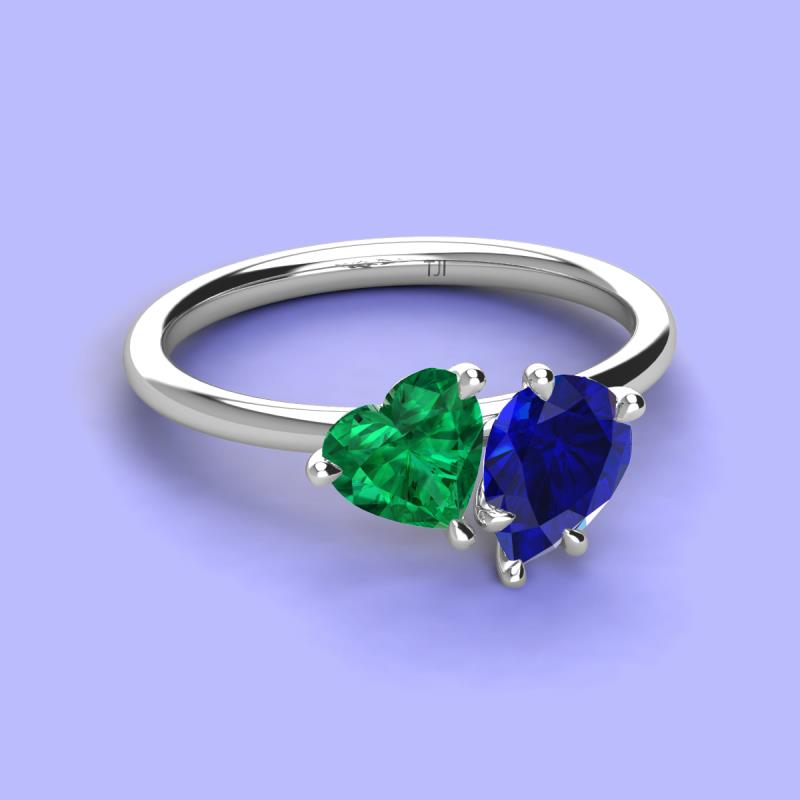 There's something so romantic, and oh-so-enchanting about this duo two stone engagement ring. This spectacular design features Heart Shape Lab Created Emerald and Pear Shape Lab Created Blue Sapphire that sets at slight angles towards each other.