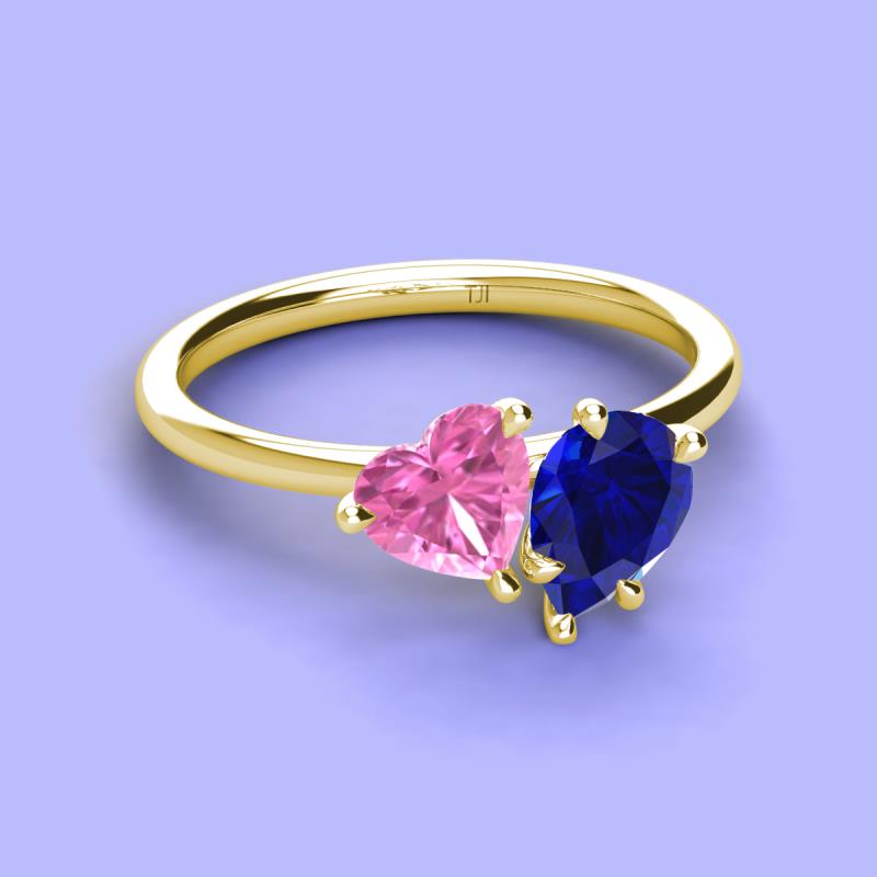 There's something so romantic, and oh-so-enchanting about this duo two stone engagement ring. This spectacular design features Heart & Pear Shape Lab Created Pink Sapphire & Created Blue Sapphire that sets at slight angles towards each other.