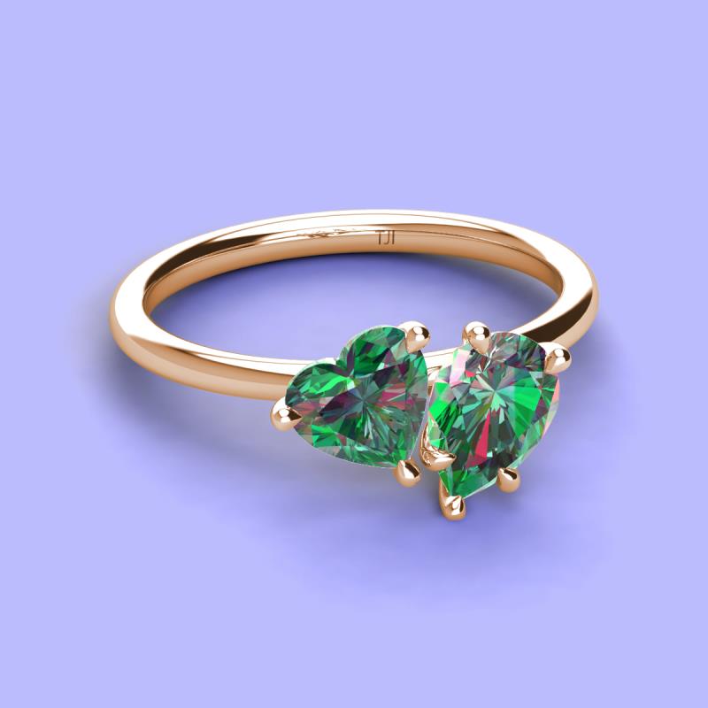 There's something so romantic, and oh-so-enchanting about this duo two stone engagement ring. This spectacular design features Heart & Pear Shape Lab Created Alexandrite that sets at slight angles towards each other.