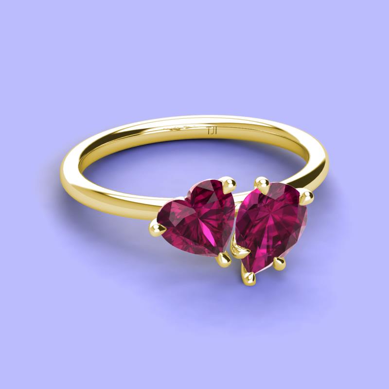 There's something so romantic, and oh-so-enchanting about this duo two stone engagement ring. This spectacular design features Heart & Pear shape Rhodolite Garnet that sets at slight angles towards each other.