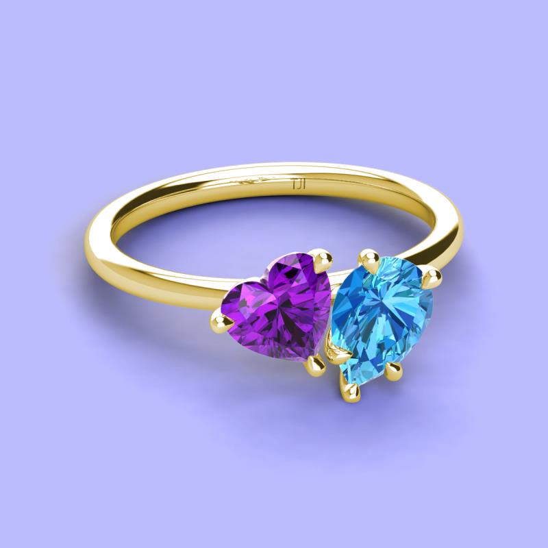 There's something so romantic, and oh-so-enchanting about this duo two stone engagement ring. This spectacular design features Heart shape Amethyst and Pear Shape Blue Topaz that sets at slight angles towards each other.