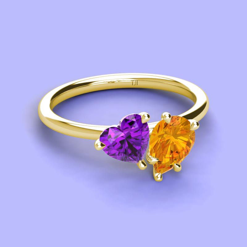 There's something so romantic, and oh-so-enchanting about this duo two stone engagement ring. This spectacular design features Heart shape Amethyst and Pear Shape Citrine that sets at slight angles towards each other.