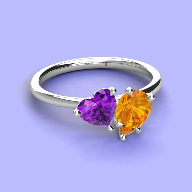 There's something so romantic, and oh-so-enchanting about this duo two stone engagement ring. This spectacular design features Heart shape Amethyst and Pear Shape Citrine that sets at slight angles towards each other.