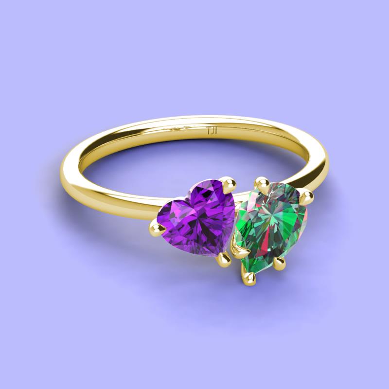 There's something so romantic, and oh-so-enchanting about this duo two stone engagement ring. This spectacular design features Heart shape Amethyst and Pear Shape Lab Created Alexandrite that sets at slight angles towards each other.