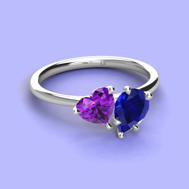 There's something so romantic, and oh-so-enchanting about this duo two stone engagement ring. This spectacular design features Heart shape Amethyst and Pear Shape Lab Created Blue Sapphire that sets at slight angles towards each other.