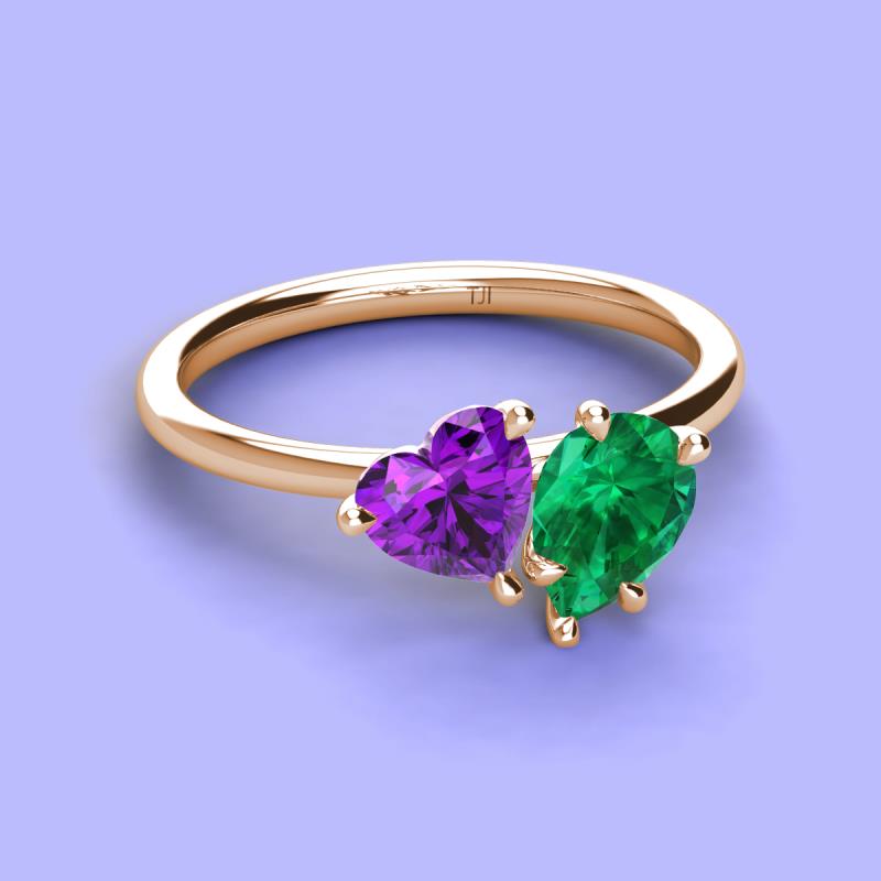 There's something so romantic, and oh-so-enchanting about this duo two stone engagement ring. This spectacular design features Heart shape Amethyst and Pear Shape Lab Created Emerald that sets at slight angles towards each other.
