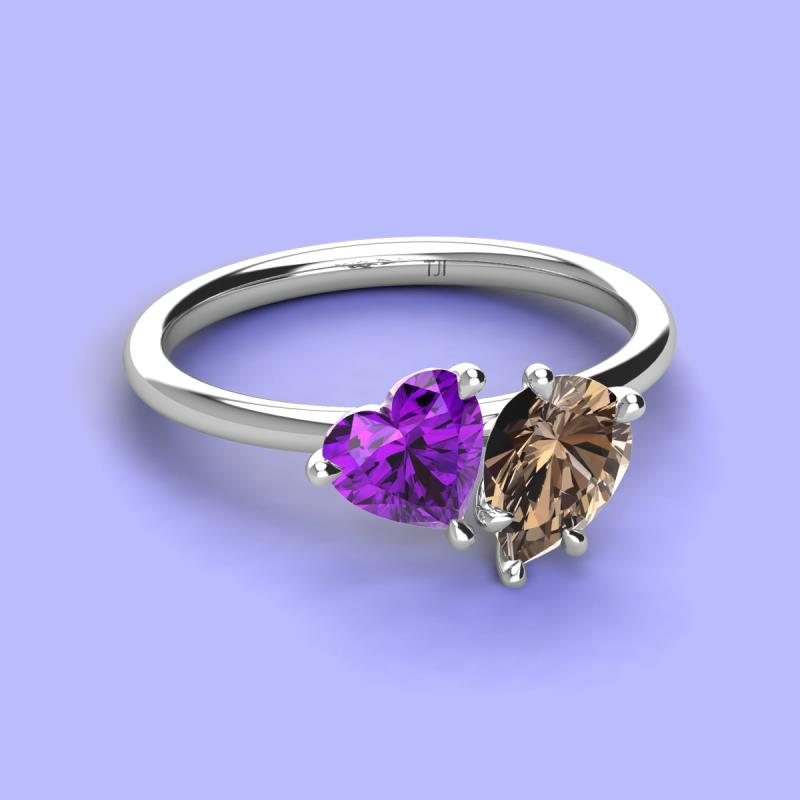 There's something so romantic, and oh-so-enchanting about this duo two stone engagement ring. This spectacular design features Heart shape Amethyst and Pear Shape Smoky Quartz that sets at slight angles towards each other.