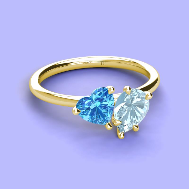 There's something so romantic, and oh-so-enchanting about this duo two stone engagement ring. This spectacular design features Heart shape Blue Topaz and Pear Shape Aquamarine that sets at slight angles towards each other.
