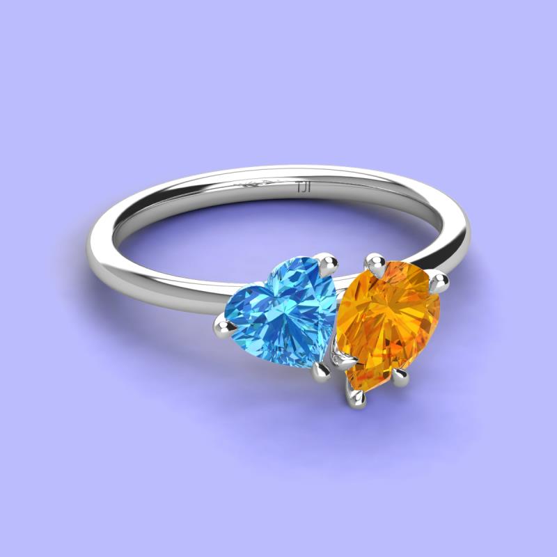 There's something so romantic, and oh-so-enchanting about this duo two stone engagement ring. This spectacular design features Heart shape Blue Topaz and Pear Shape Citrine that sets at slight angles towards each other.