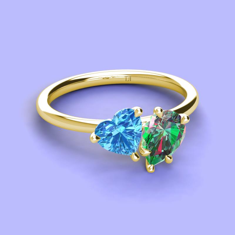 There's something so romantic, and oh-so-enchanting about this duo two stone engagement ring. This spectacular design features Heart shape Blue Topaz and Pear Shape Lab Created Alexandrite that sets at slight angles towards each other.
