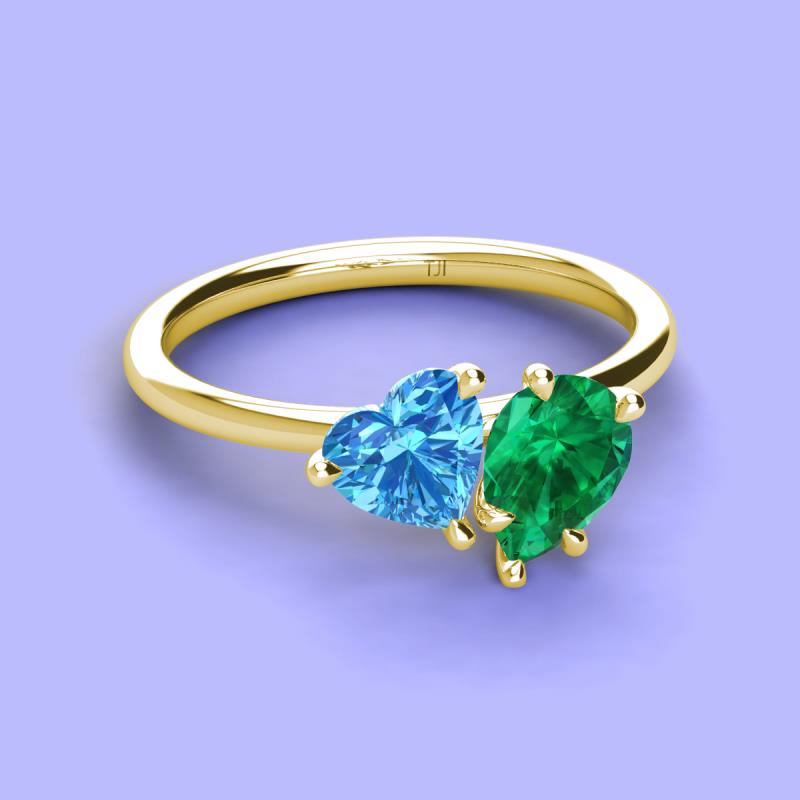 There's something so romantic, and oh-so-enchanting about this duo two stone engagement ring. This spectacular design features Heart shape Blue Topaz and Pear Shape Lab Created Emerald that sets at slight angles towards each other.