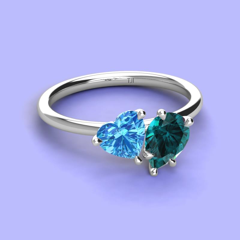 There's something so romantic, and oh-so-enchanting about this duo two stone engagement ring. This spectacular design features Heart shape Blue Topaz and Pear Shape London Blue Topaz that sets at slight angles towards each other.