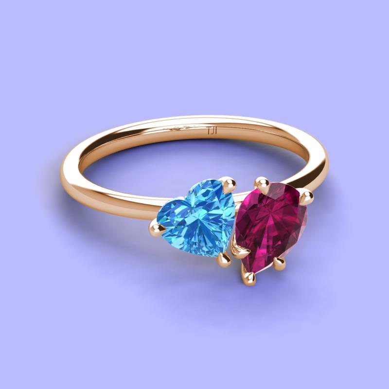 There's something so romantic, and oh-so-enchanting about this duo two stone engagement ring. This spectacular design features Heart shape Blue Topaz and Pear Shape Rhodolite Garnet that sets at slight angles towards each other.