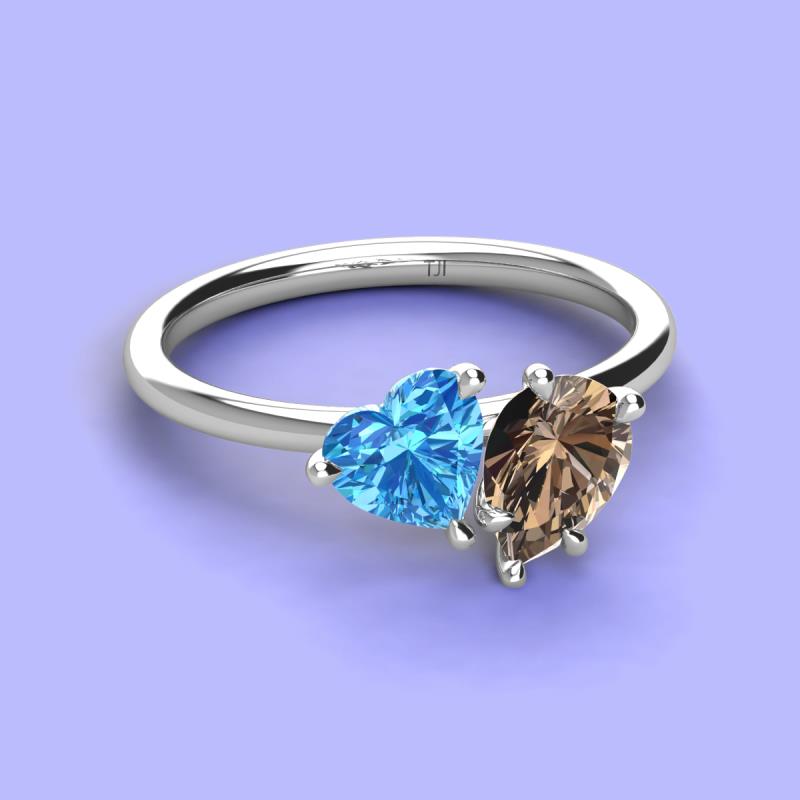 There's something so romantic, and oh-so-enchanting about this duo two stone engagement ring. This spectacular design features Heart shape Blue Topaz and Pear Shape Smoky Quartz that sets at slight angles towards each other.