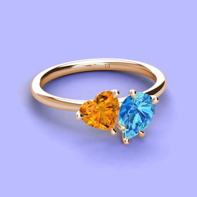 There's something so romantic, and oh-so-enchanting about this duo two stone engagement ring. This spectacular design features Heart shape Citrine and Pear Shape Blue Topaz that sets at slight angles towards each other.