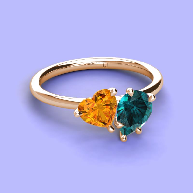There's something so romantic, and oh-so-enchanting about this duo two stone engagement ring. This spectacular design features Heart shape Citrine and Pear Shape London Blue Topaz that sets at slight angles towards each other.