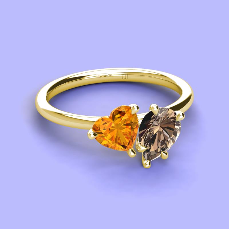 There's something so romantic, and oh-so-enchanting about this duo two stone engagement ring. This spectacular design features Heart shape Citrine and Pear Shape Smoky Quartz that sets at slight angles towards each other.