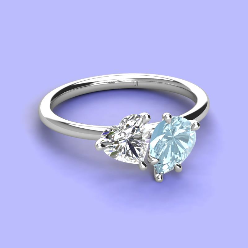 There's something so romantic, and oh-so-enchanting about this duo two stone engagement ring. This spectacular design features Heart Shape Forever Brilliant Moissanite and Pear Shape Aquamarine that sets at slight angles towards each other.