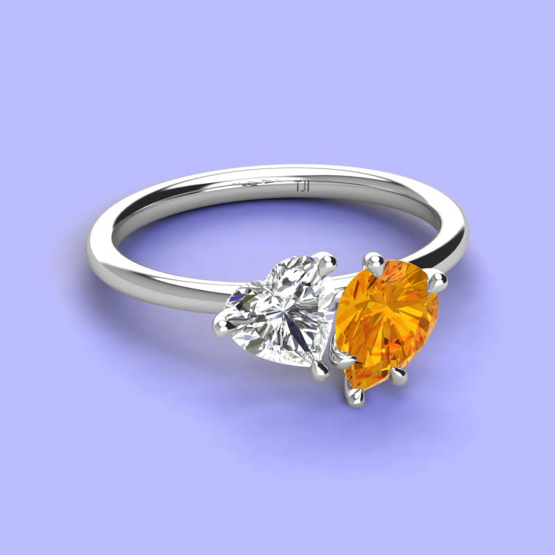 There's something so romantic, and oh-so-enchanting about this duo two stone engagement ring. This spectacular design features Heart Shape Forever One Moissanite and Pear Shape Citrine that sets at slight angles towards each other.