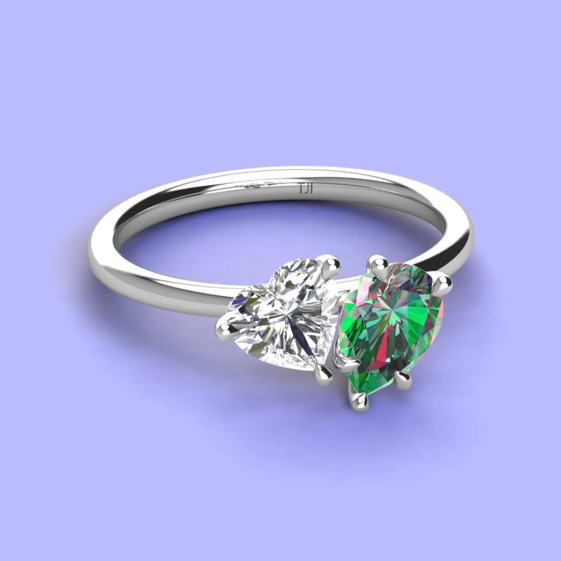 There's something so romantic, and oh-so-enchanting about this duo two stone engagement ring. This spectacular design features Heart Shape Forever One Moissanite and Pear Shape Lab Created Alexandrite that sets at slight angles towards each other.