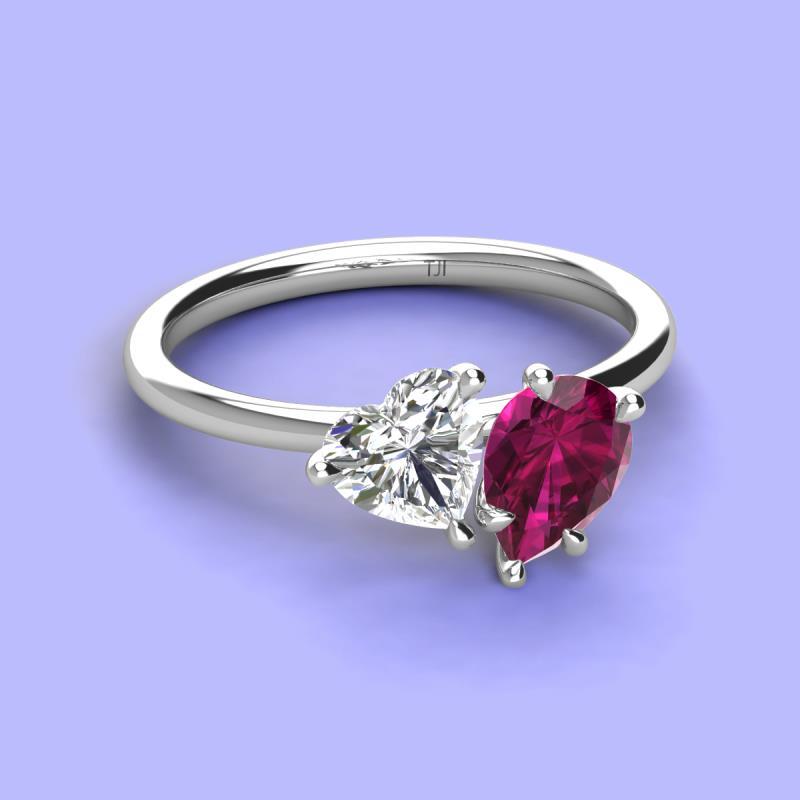 There's something so romantic, and oh-so-enchanting about this duo two stone engagement ring. This spectacular design features Heart Shape Forever One Moissanite and Pear Shape Rhodolite Garnet that sets at slight angles towards each other.