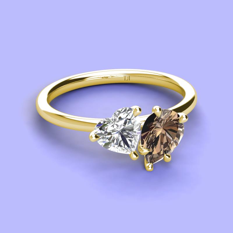 There's something so romantic, and oh-so-enchanting about this duo two stone engagement ring. This spectacular design features Heart Shape Forever One Moissanite and Pear Shape Smoky Quartz that sets at slight angles towards each other.