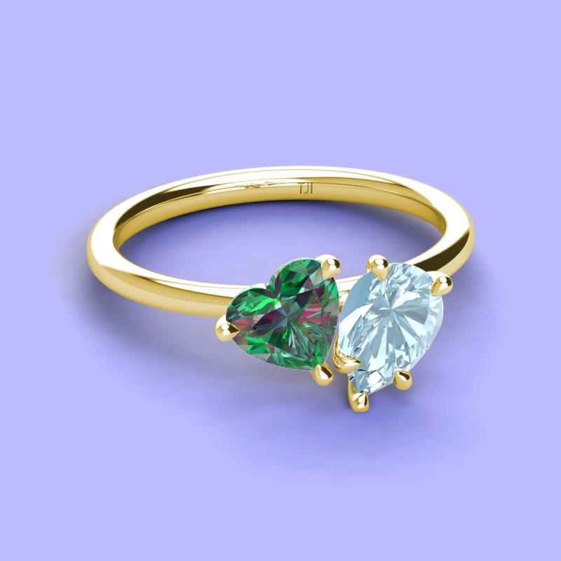 There's something so romantic, and oh-so-enchanting about this duo two stone engagement ring. This spectacular design features Heart Shape Lab Created Alexandrite and Pear Shape Aquamarine that sets at slight angles towards each other.