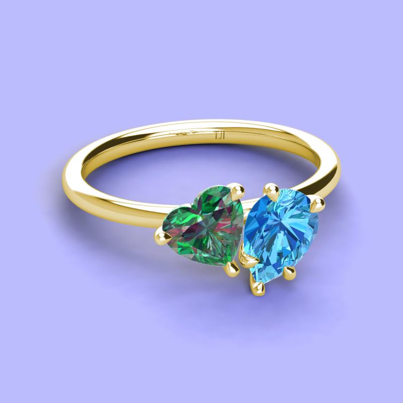 There's something so romantic, and oh-so-enchanting about this duo two stone engagement ring. This spectacular design features Heart Shape Lab Created Alexandrite and Pear Shape Blue Topaz that sets at slight angles towards each other.