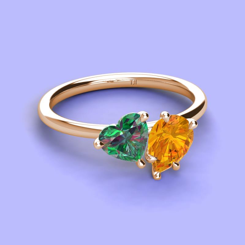 There's something so romantic, and oh-so-enchanting about this duo two stone engagement ring. This spectacular design features Heart Shape Lab Created Alexandrite and Pear Shape Citrine that sets at slight angles towards each other.