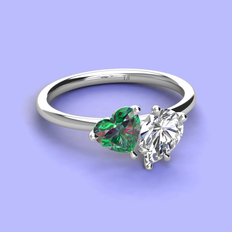 There's something so romantic, and oh-so-enchanting about this duo two stone engagement ring. This spectacular design features Heart Shape Lab Created Alexandrite and Pear Shape Forever Brilliant Moissanite that sets at slight angles towards each other.
