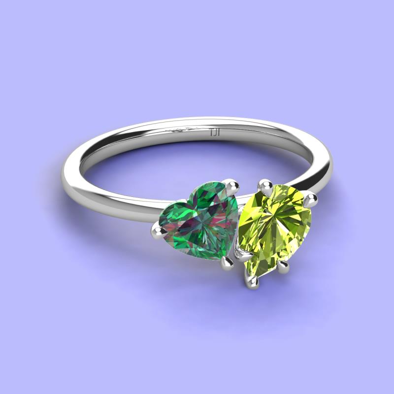 There's something so romantic, and oh-so-enchanting about this duo two stone engagement ring. This spectacular design features Heart Shape Lab Created Alexandrite and Pear Shape Peridot that sets at slight angles towards each other.