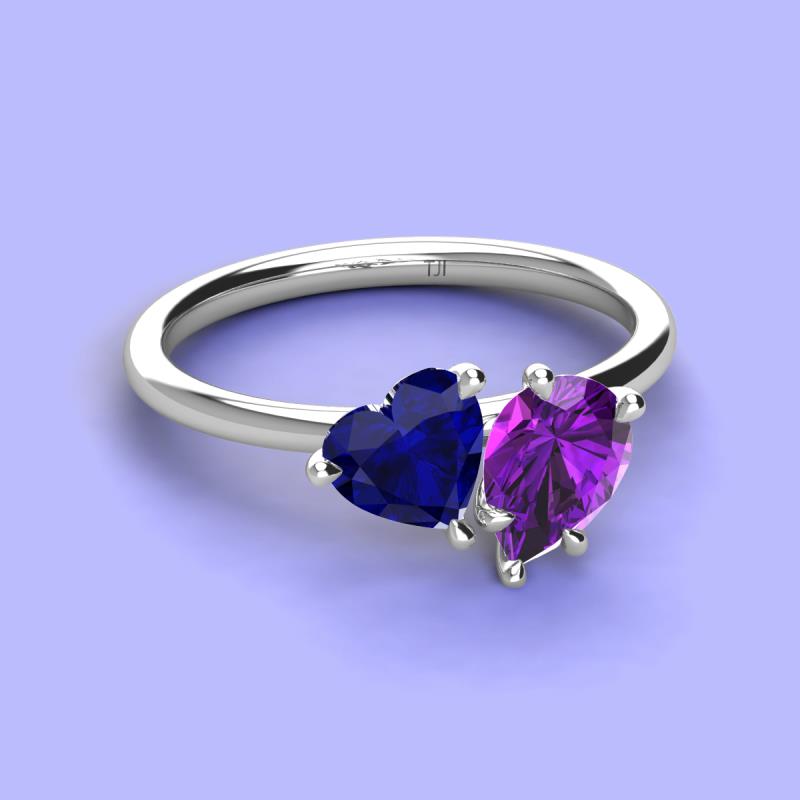 There's something so romantic, and oh-so-enchanting about this duo two stone engagement ring. This spectacular design features Heart Shape Lab Created Blue Sapphire and Pear Shape Amethyst that sets at slight angles towards each other.