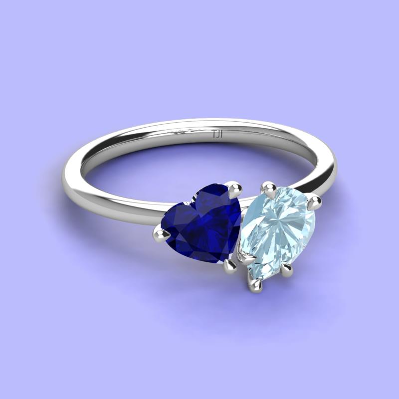 There's something so romantic, and oh-so-enchanting about this duo two stone engagement ring. This spectacular design features Heart Shape Lab Created Blue Sapphire and Pear Shape Aquamarine that sets at slight angles towards each other.